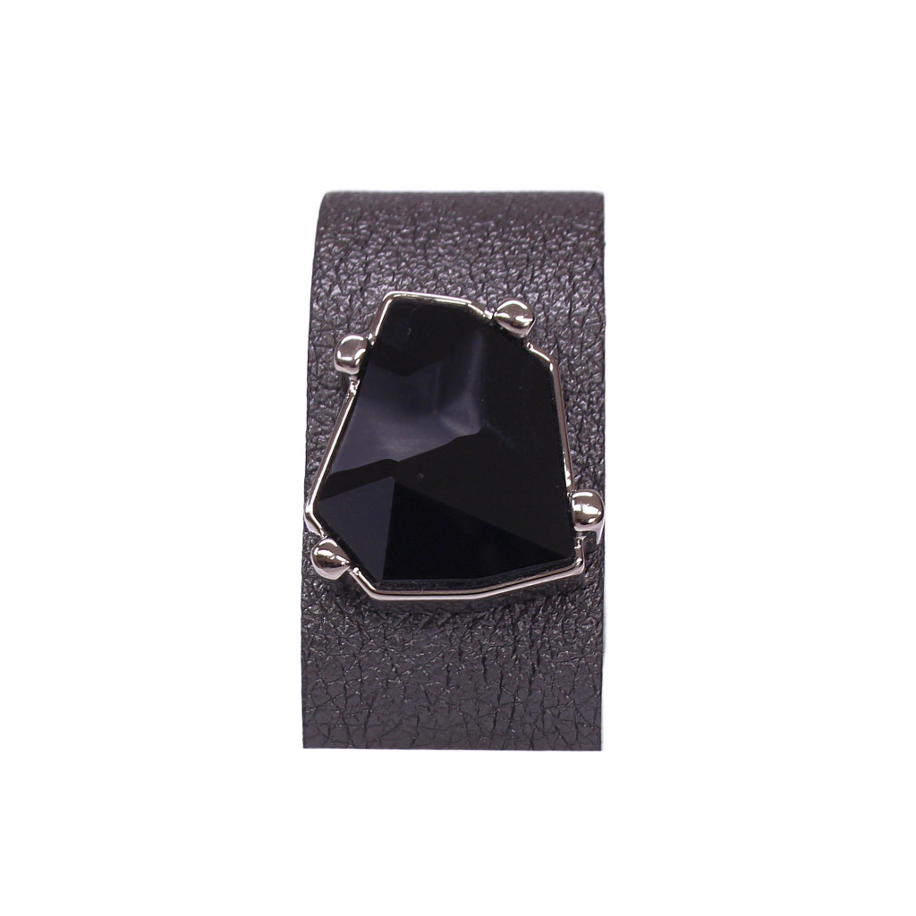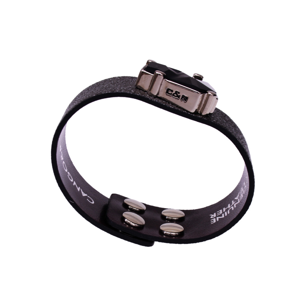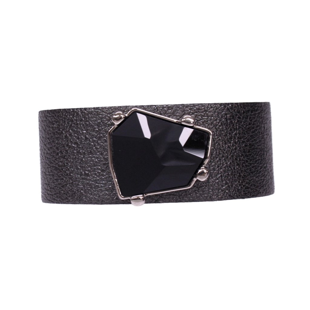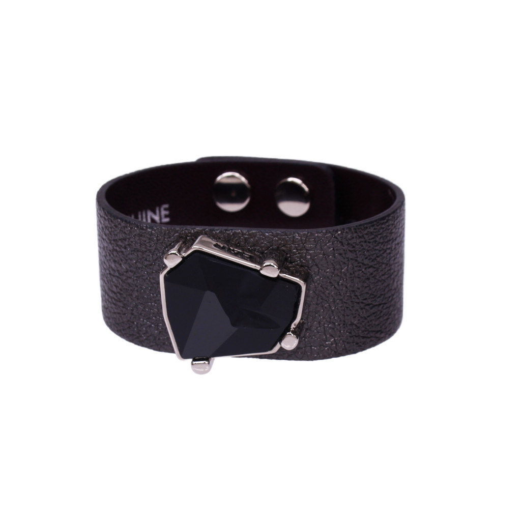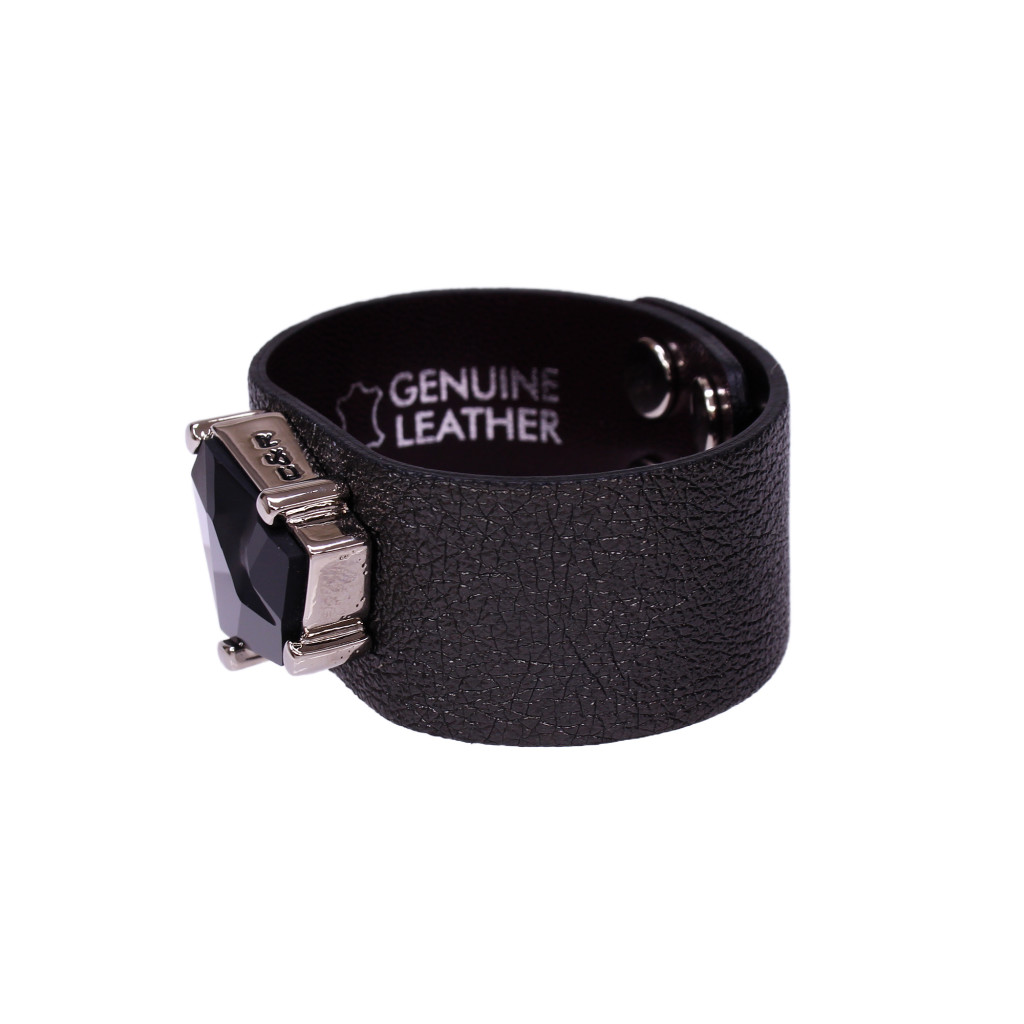A karkötő alapja egy széles, fekete színű prémium olasz bőr, karakteres, modern megjelenést ad. A központi dísz egy különleges, Jean Paul Gaultier által tervezett fekete Swarovski kristály,ami ezüst színű foglalatba illesztve kap helyet.